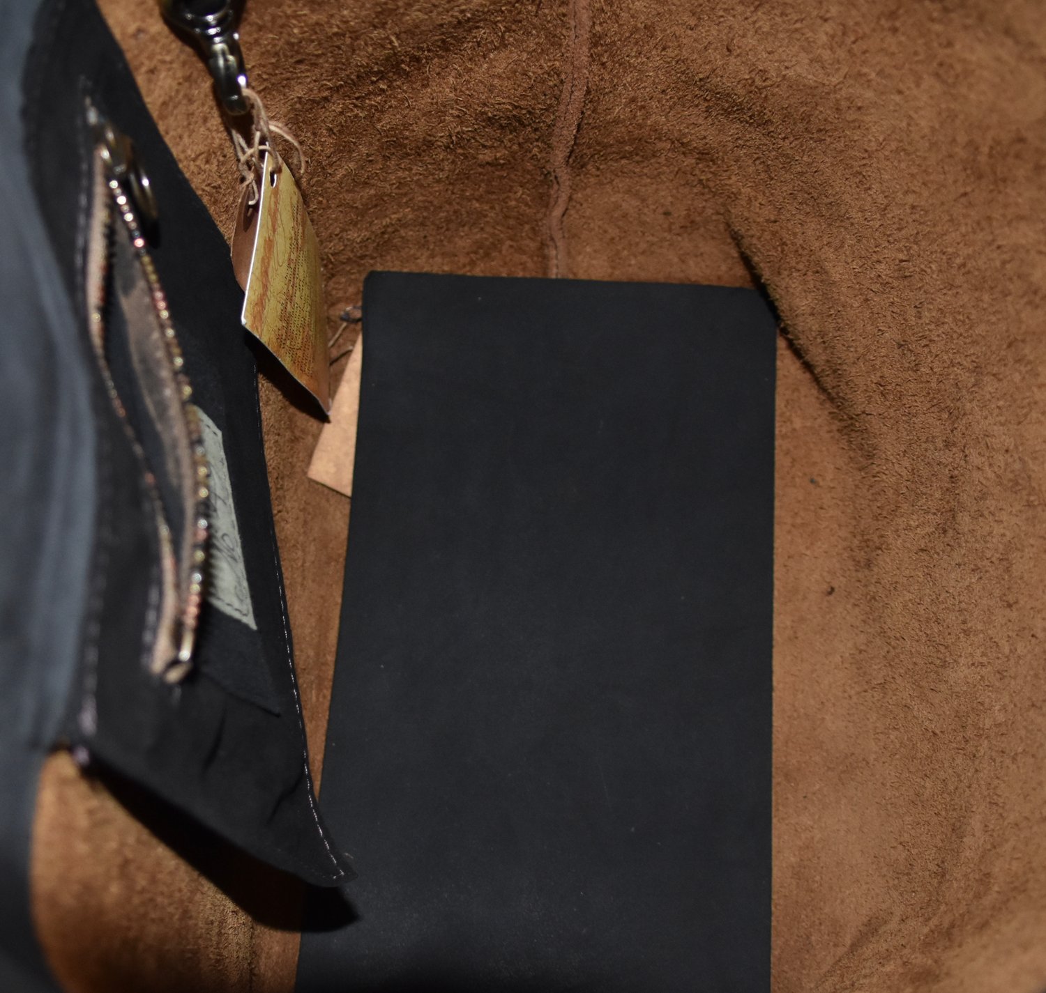 Neue Tote 49 is made of an oiled caramel brown cowhide, and has a black suede facing. The strap is lined with suede, and has a drop interior pocket, with RiRi zipper opening. The Tote has a snap closure. All of the natural edges are part of the design.