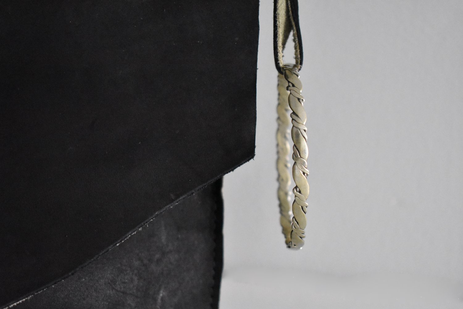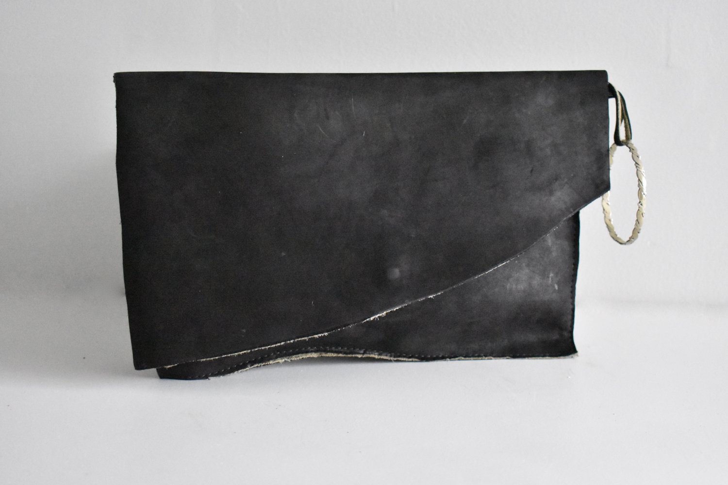 Peace Clutch no. 145 is made of a beautiful soft black italian nubuck leather. It is an envelope style, which makes a great clutch. Interior credit card, pocket, dividing pocket and a key hook. A sterling silver bangle is used as a tuck away handle, chrome hardware to match the sterling bangle.