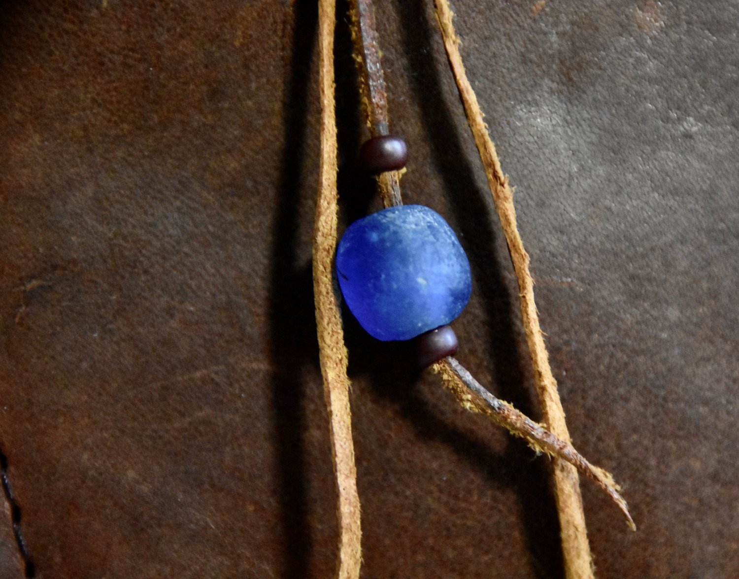 Pouch 40 is made with an oiled leather called Montana. A sea glass bead adorns the bag. It is unlined and has an interior pocket for cc and key hook and cross body strap.