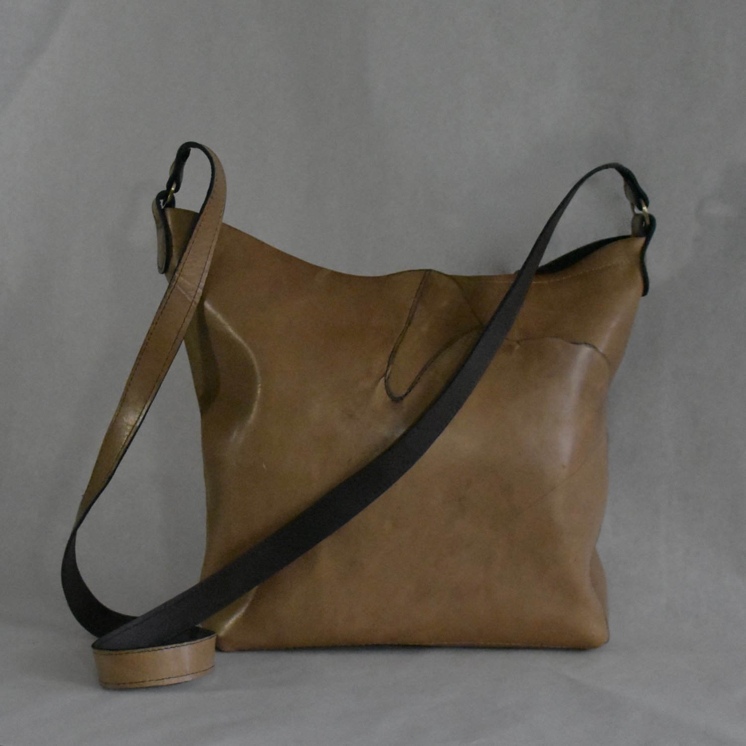 15" wide x 13" high 52" cross over strap is lined with brown leather.