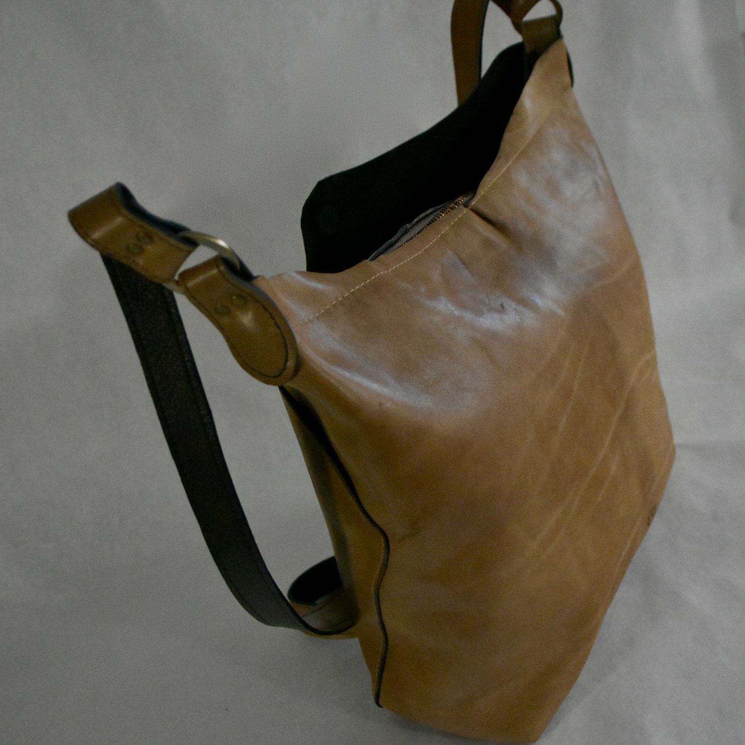 Peace Bag #362 is made of full thickness caramel cowhide, with all of the natural beauty marks and natural edges that define the bag. The back of the bag has beautiful striations. Snap closure, for a front pocket that is lined with brown suede. The interior is accessed with a RIRI zipper and fullly lined with brown suede.