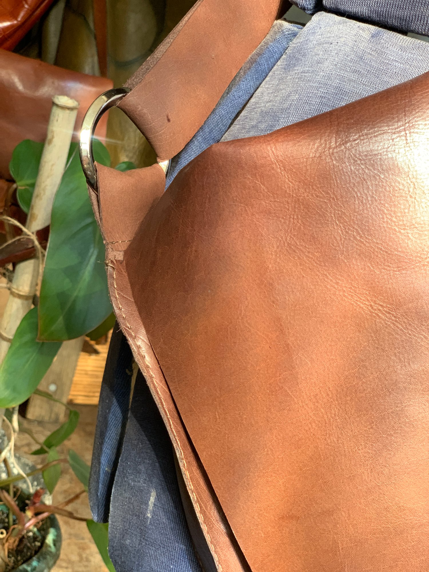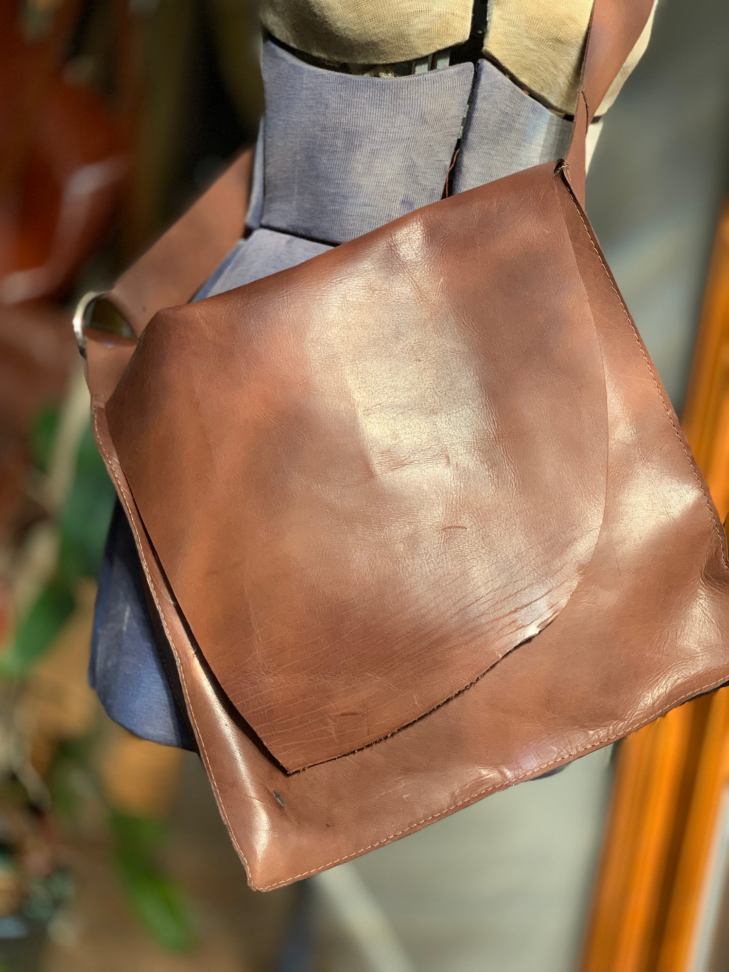The Sylvie Peace Bags are one of kind organic, uniquely shaped and designed bags. They vary size, shape, and design. Peace bags are uniquely fashionable bags that can be carried to the mall or to the symphony. Made of the same high quality leathers as all Luna Jaze bags, Peace bags are a fashionable way to carry your personals belongings; an integral leather pocket for your bills or cc, and hidden hook for your keys are added for your convenience, adorned with an antique buttons or beads. These bags look great and are one of a kind. Three % of the retail sales, from the peace bags are donated to an NPO aligned with peaceful initiatives, currently the donations go to the ASPCA.
