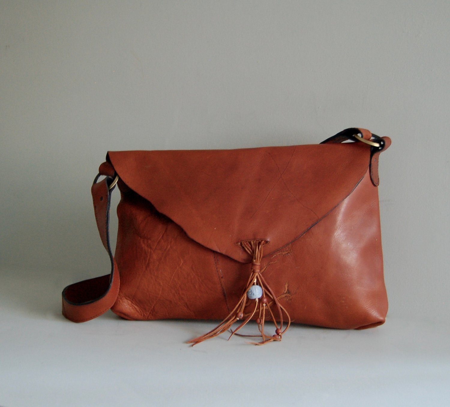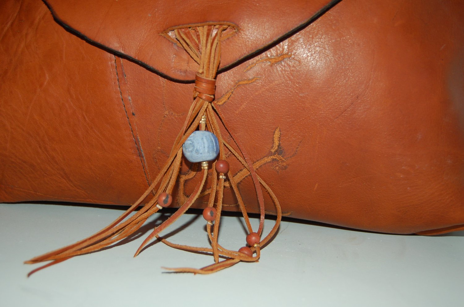 Saddle like Poney Bag 75, made with the natural beauty marks, adorned with beads from Africa; is a perfect travel or computer bag. It s made with an oiled Brazilian leather, and lined with navy suede, and has a secure RiRi zipper. Original price was 375$.