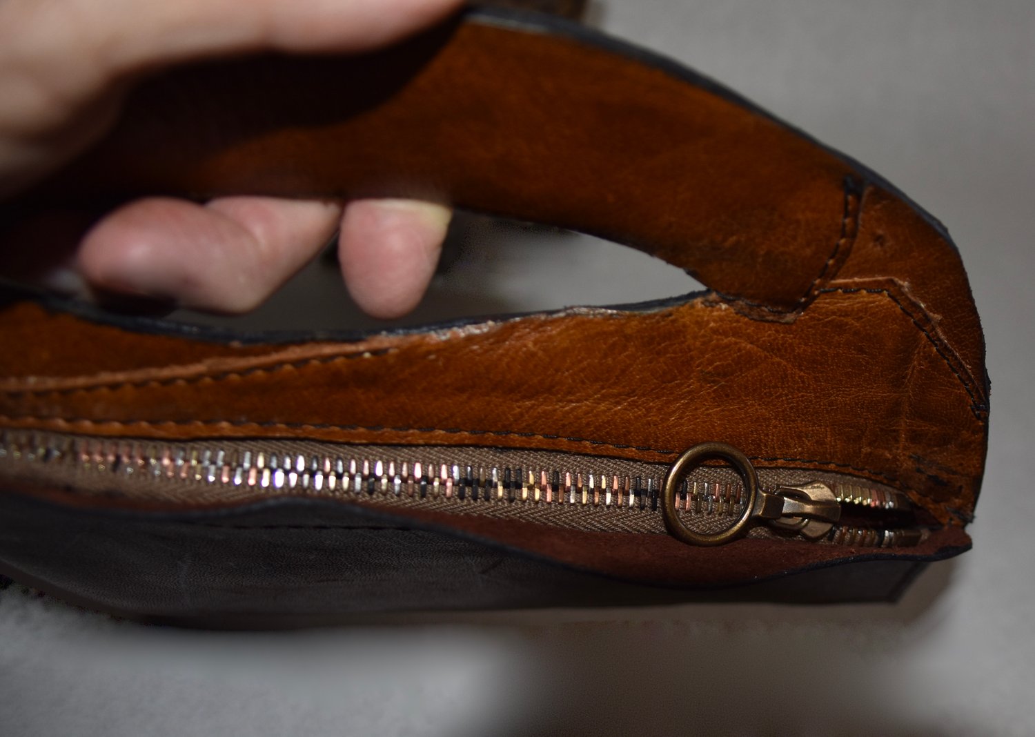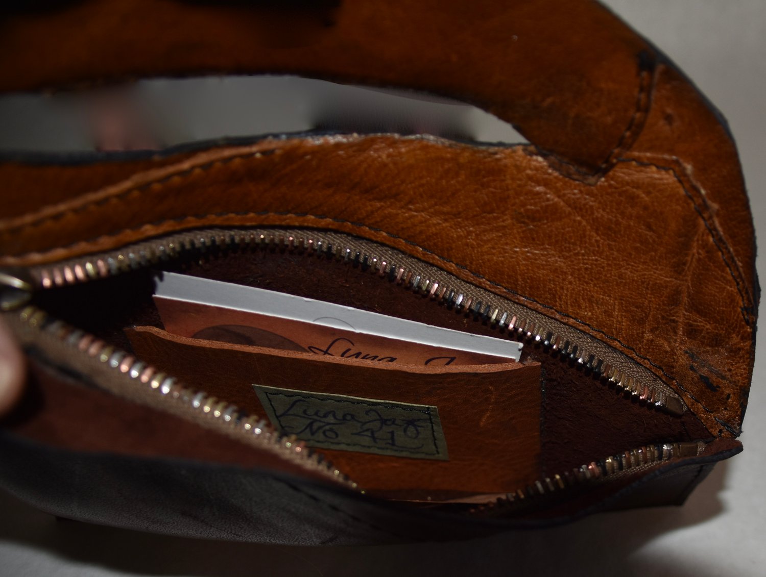 Pouch 41 is made with a lovely distressed leather with all of the natural beauty marks. There was a natural hole which I turned into the handle. A RiRi zipper secures the the interior of the bag.