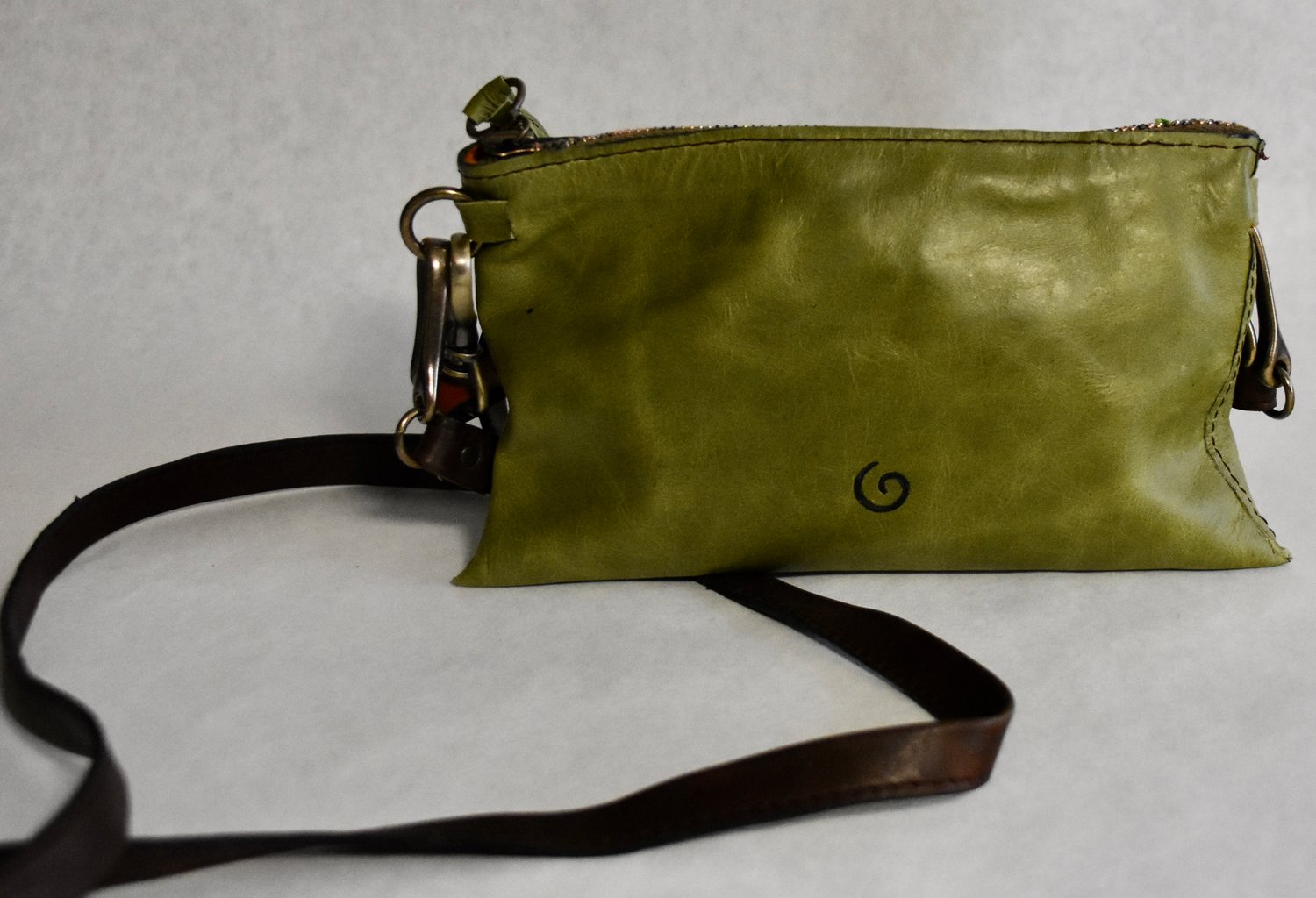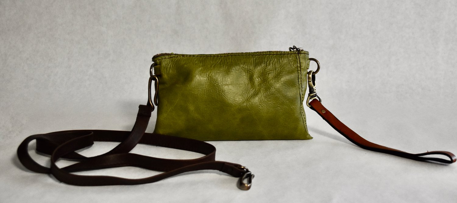 Pouch 47 is made with green leather and lined with navy suede, with an interior pocket for cc and key hook and cross body strap. It can also be converted to clutch by releasing the strap.