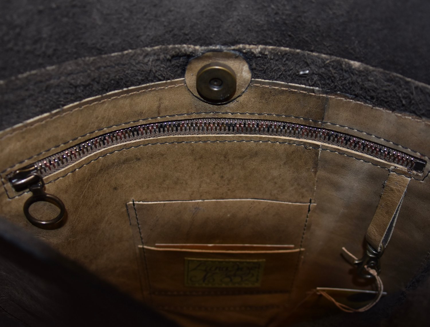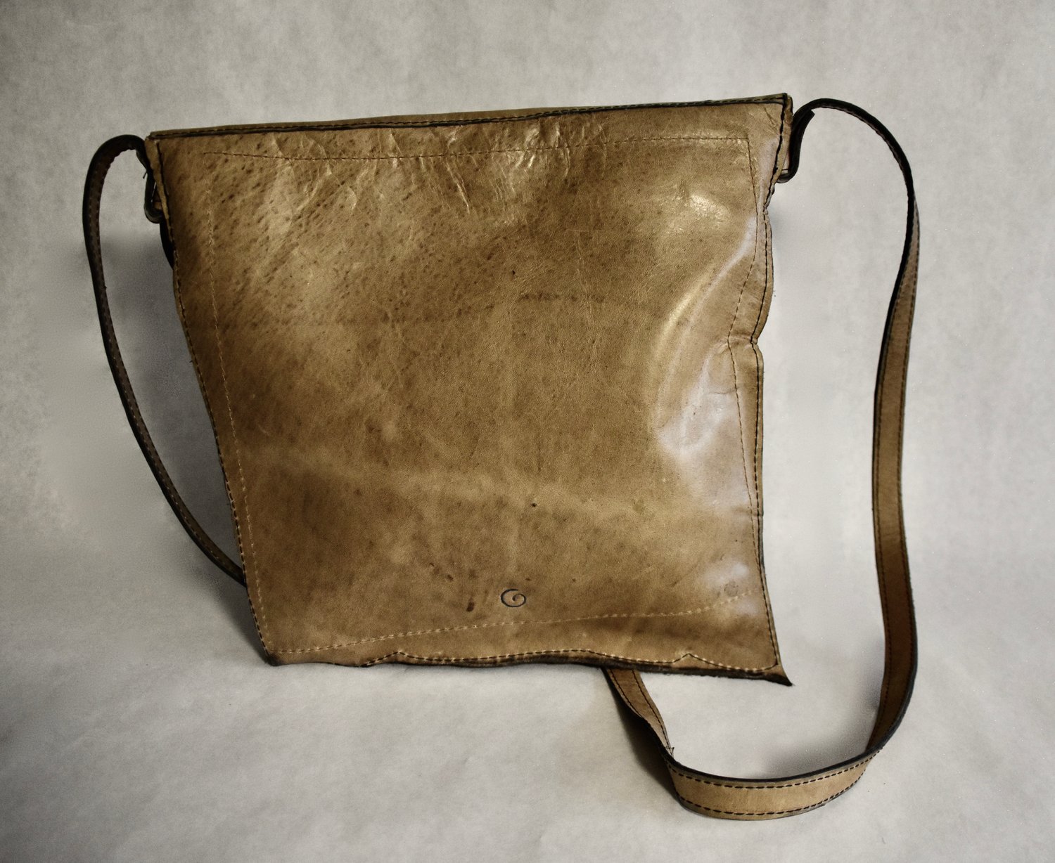Peace Bag #352 is made of full thickness cowhide, calvary bone; a lovely variegated beige color with all of the natural beauty marks and natural edges that define the bag. The front of the bag has a natural hole that becomes a design marking. It has a snap closure, interior pocket that secures personals with a custom RiRI zipper and key hook.