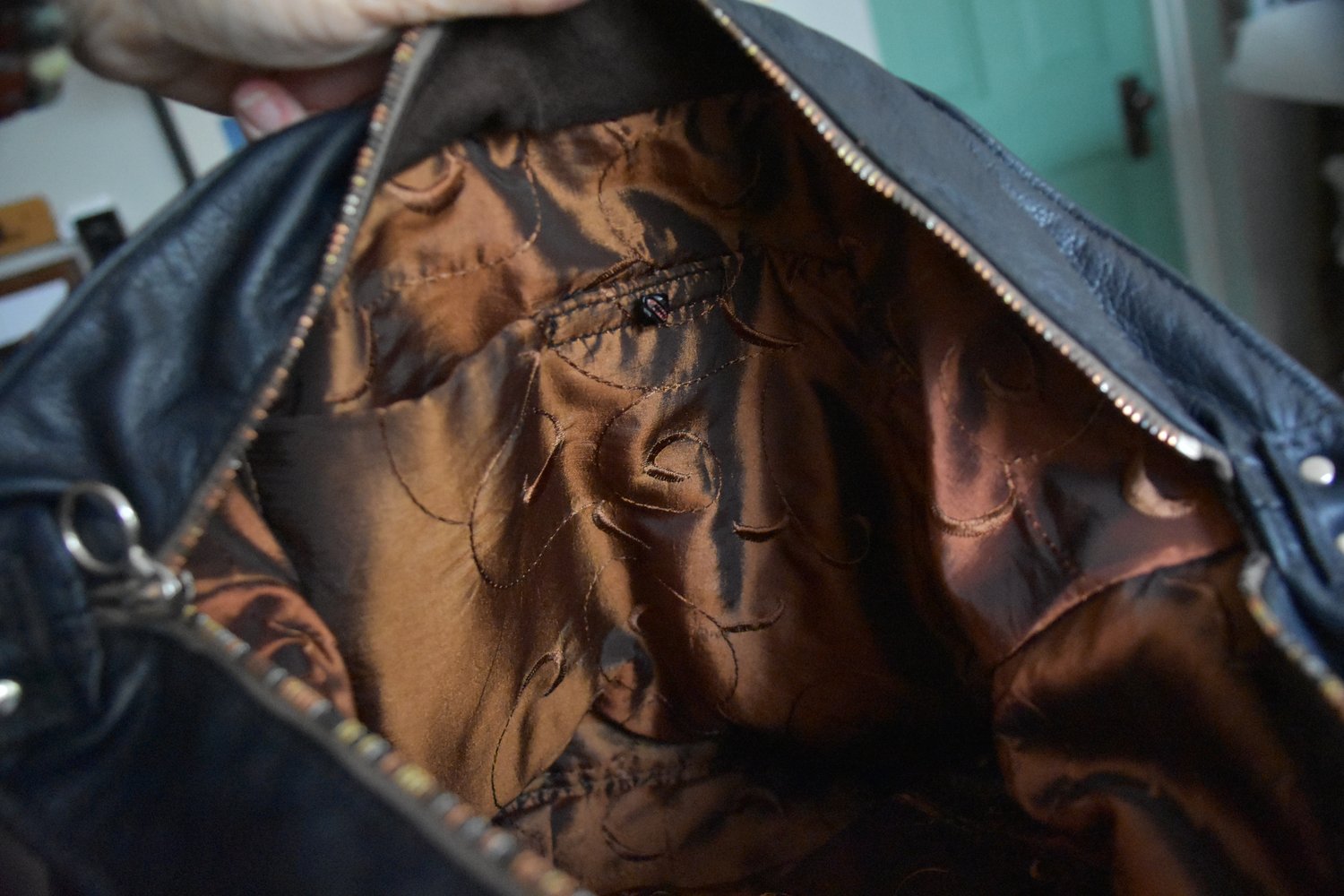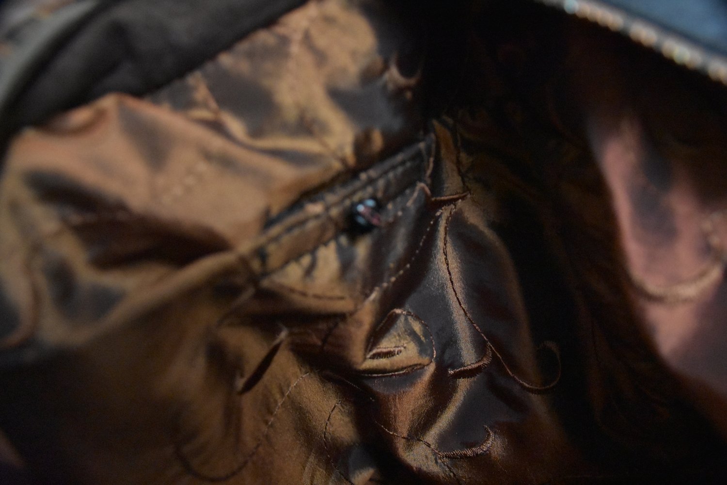 The lining is made of rust colored spiral-design poly silk which is backed with unbleached muslin and double stitched. Two Interior RIRI zippered pockets include are complemented by multiple pockets for personals, and a key hook. There are two exterior wrap around pockets which are lined with dark brown suede. Chrome hardware accent the bag. The bag rest on 4 chrome feet. It is 16" wide x 14" tall and has a 23 " strap. The opening is 25"wide, and has an additional hidden snap closure that secures the bag when open.